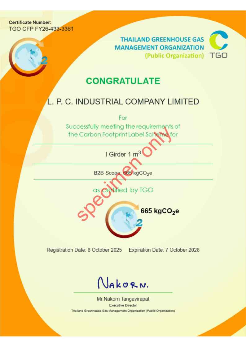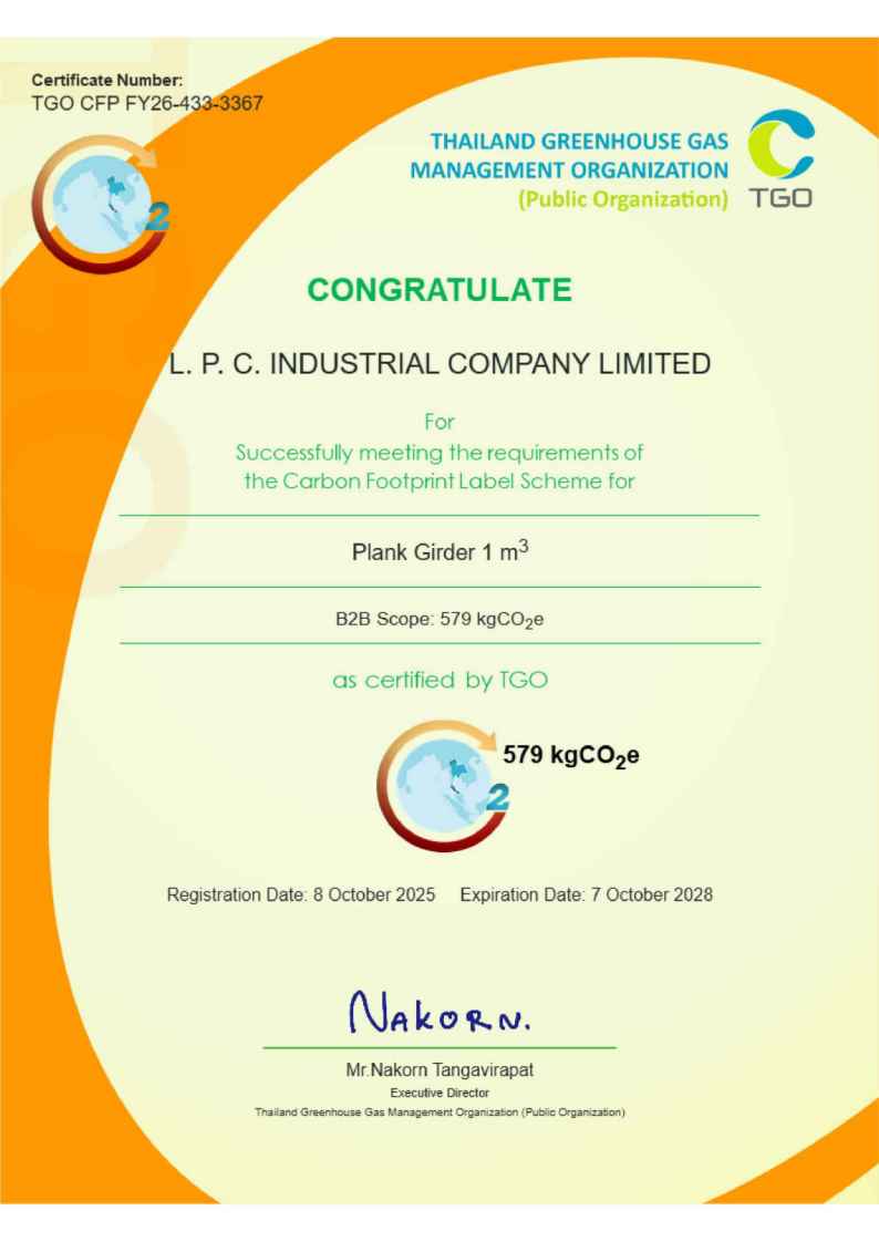 ทางบริษัท แอล.พี.ซี.อินดัสเทรียล ได้รับการขึ้นทะเบียนฉลากคาร์บอนตามประกาศ ของ องค์การบริหารจัดการก๊าซเรือนกระจก ได้รับเครื่องหมายรับรองคาร์บอนฟุตพริ้นท์ของผลิตภัณฑ์ (CFP)